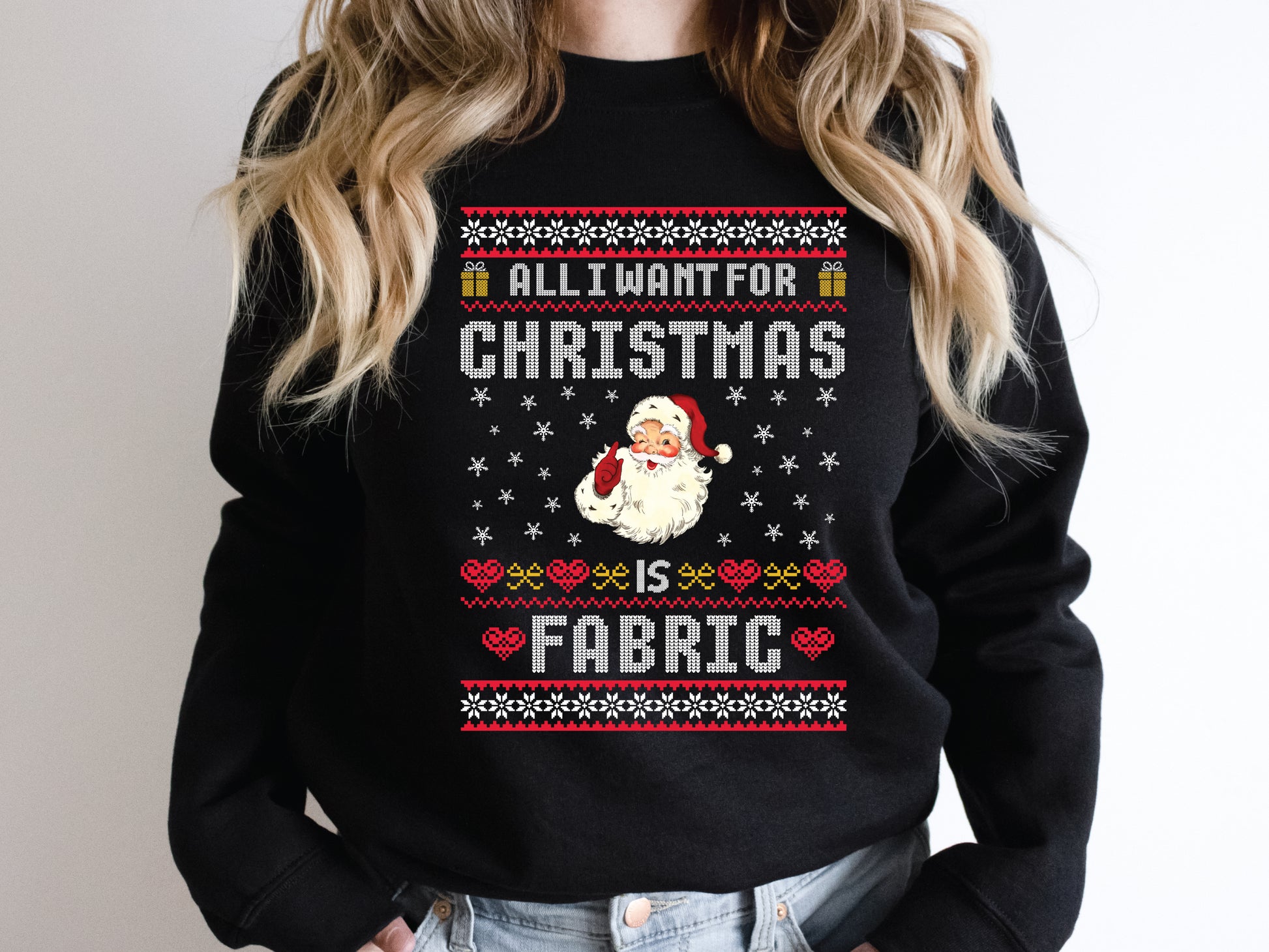 Whether you’re shopping for fabric, attending a holiday sewing class, or just enjoying a cozy quilting day, this t-shirt lets everyone know what’s at the top of your Christmas list! And if you’re looking for an ugly Christmas Sweatshirt to wear this holiday season this will be a perfect choice!