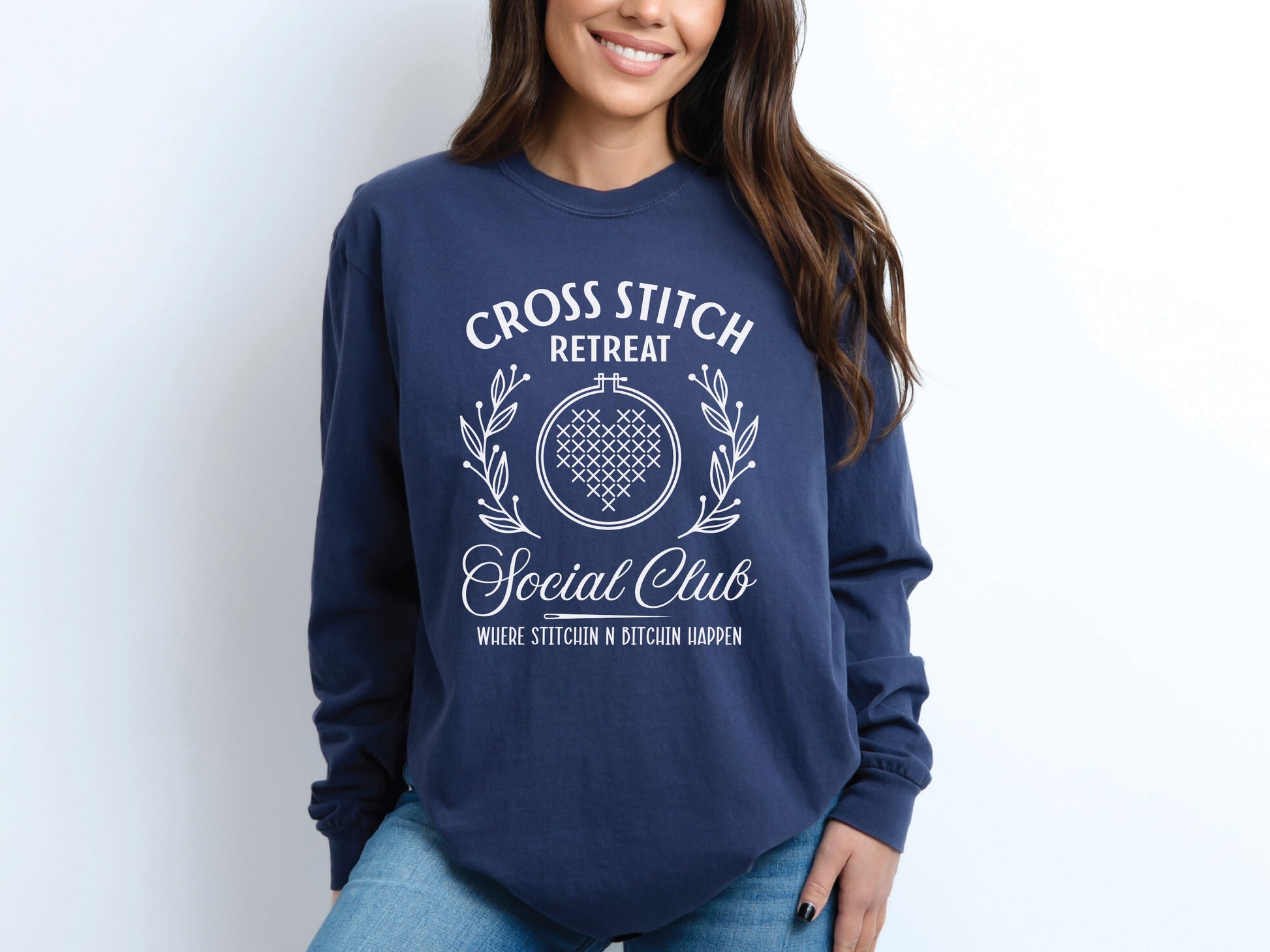Show off your retreat spirit in this fun and sassy Cross Stitch Retreat Social Club design — because that's where stitchin’ n bitchin' is bound to happen! Printed on a cozy, soft Comfort Colors long sleeve shirt, it's perfect for those long stitching sessions and late-night laughs. It’s the ultimate way to show you're serious about stitching and having a good time.