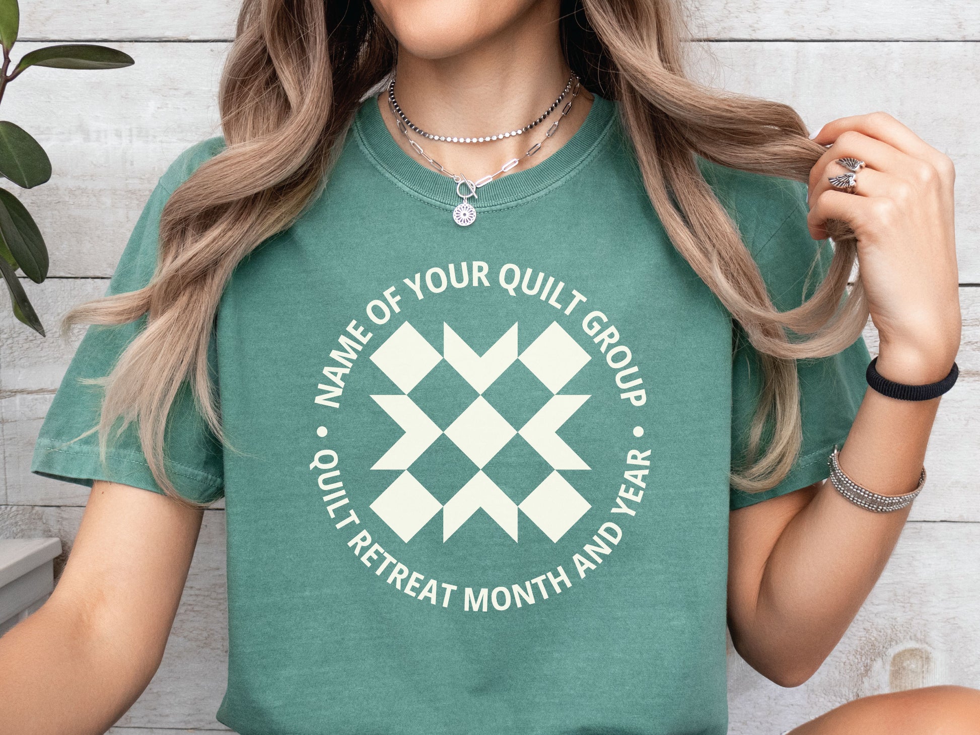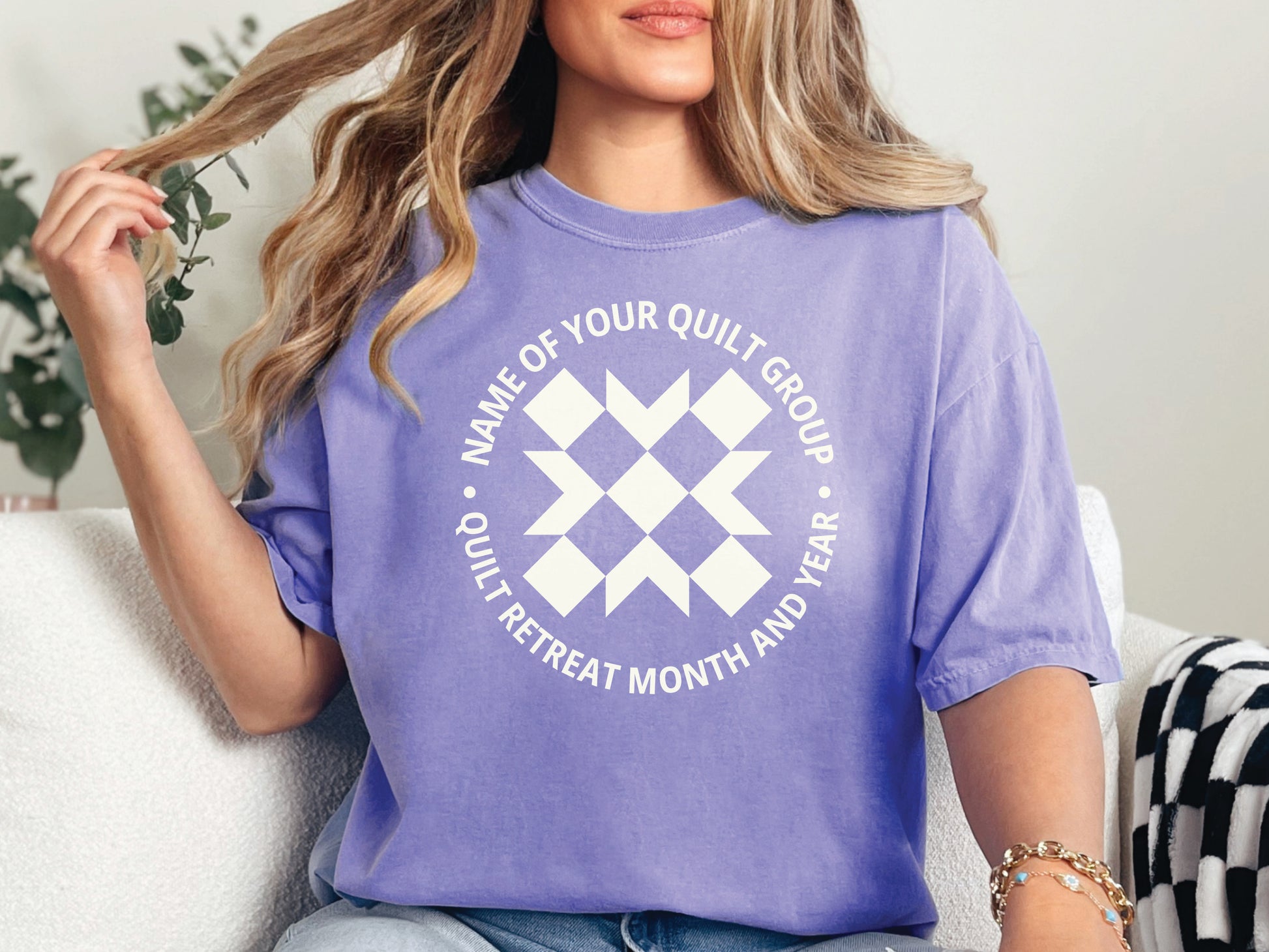 Celebrate your next retreat in comfort and style with this customizable, cozy Comfort Colors® t-shirt, designed just for quilt groups! Your group’s name wraps around the top, while “Quilt Retreat” along with the month, day, and year is printed on the bottom. A classic quilt block in the center ties it all together—making this a perfect keepsake for stitching memories together. If your group prefers different text, we’re happy to accommodate!