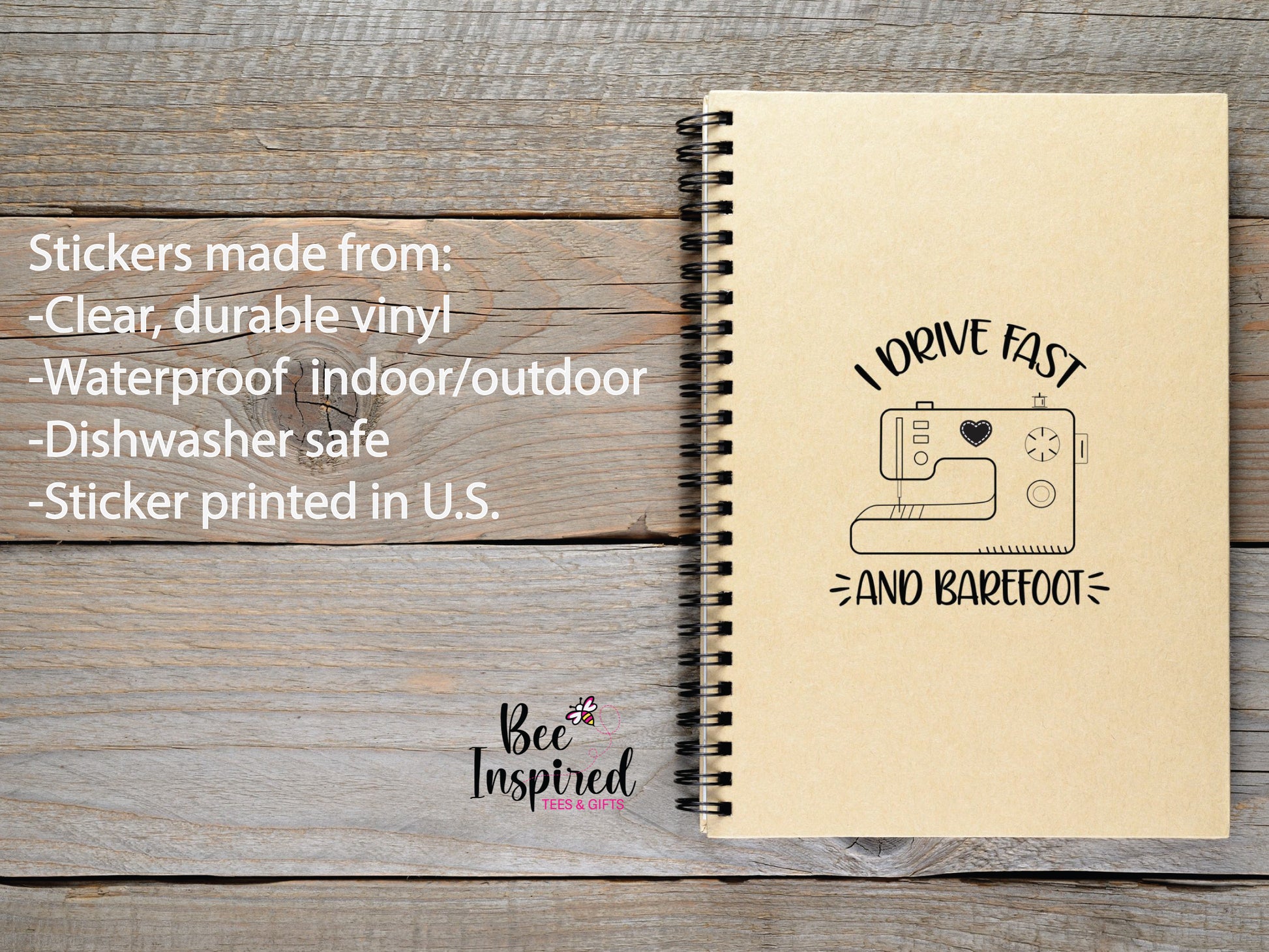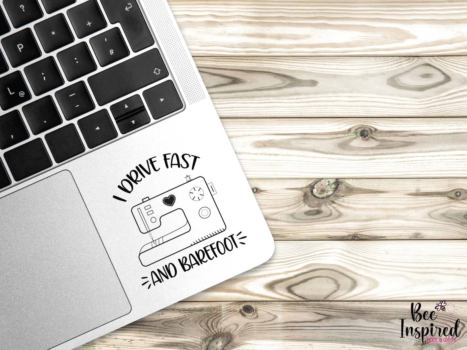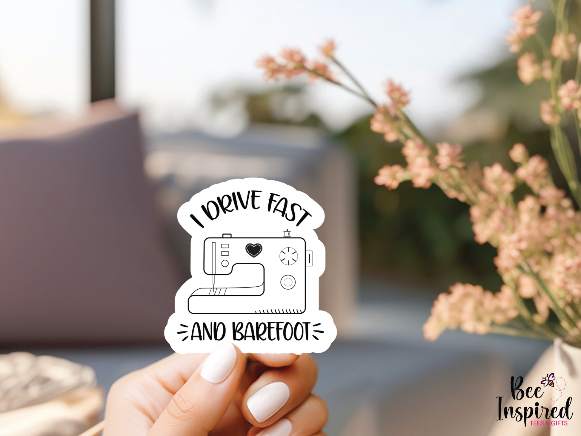 - I Drive Fast And Barefoot Sewing Vinyl Sticker size approximately 2.9” x 3”