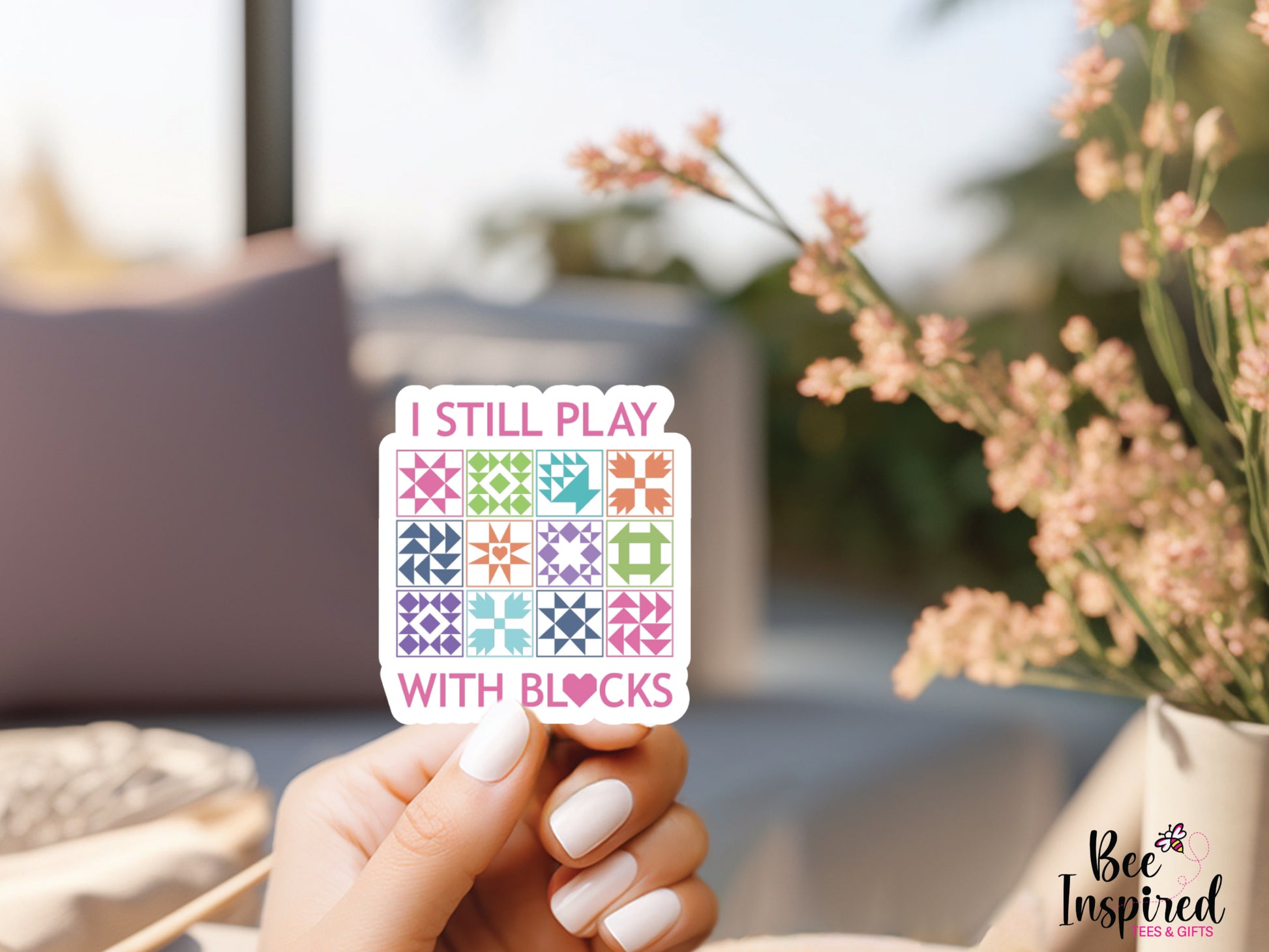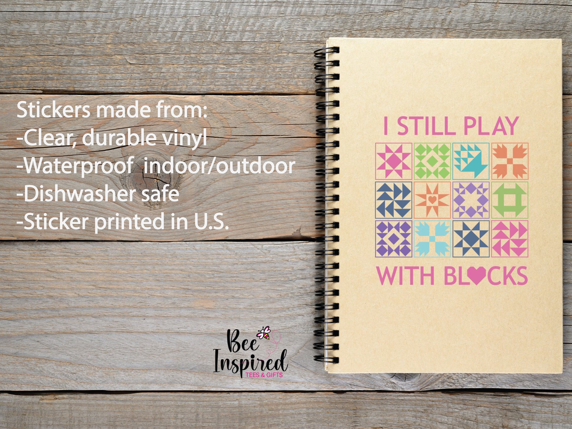 - I Still Play With Blocks Sticker size approximately 2.7” x 3”