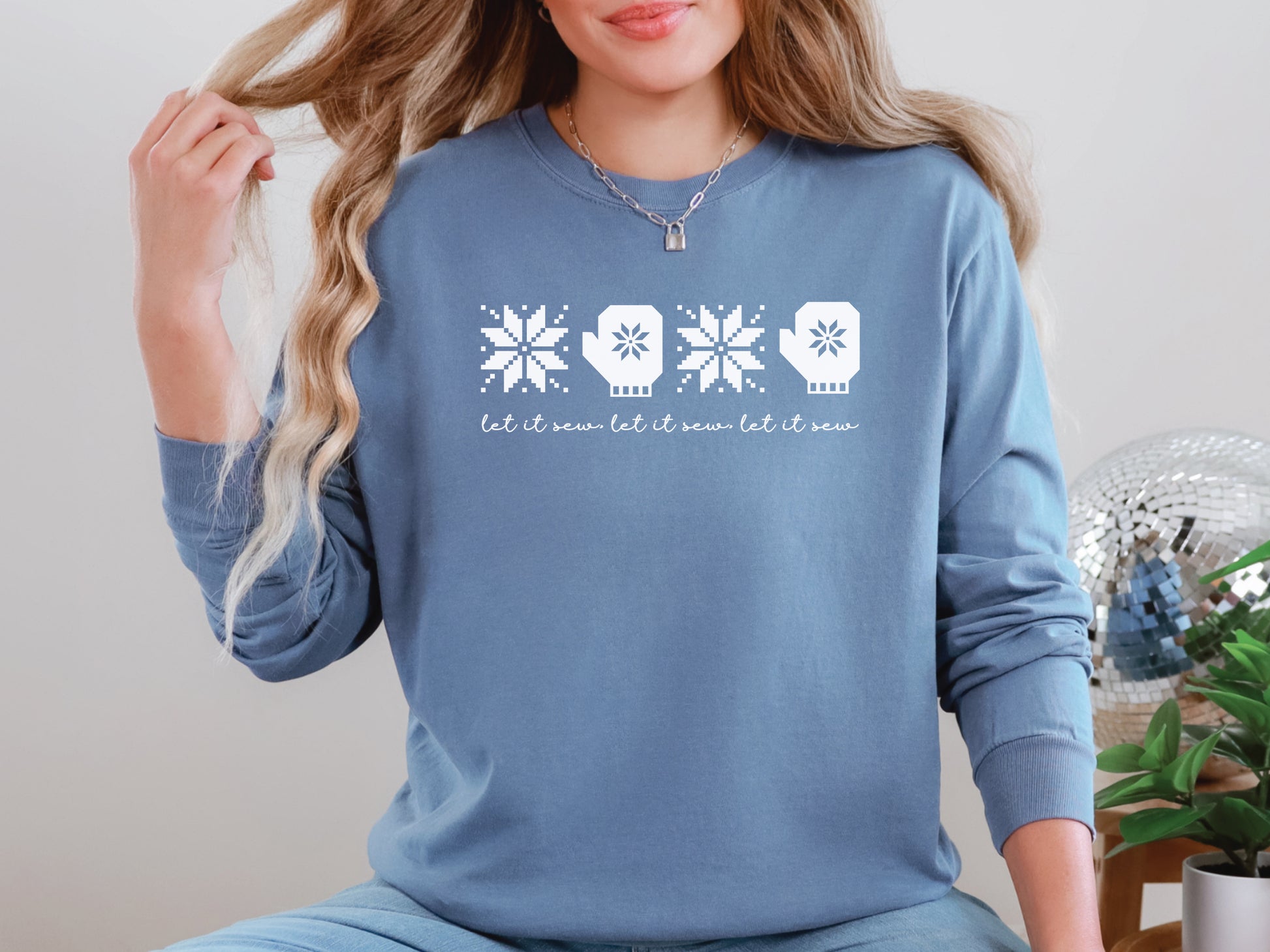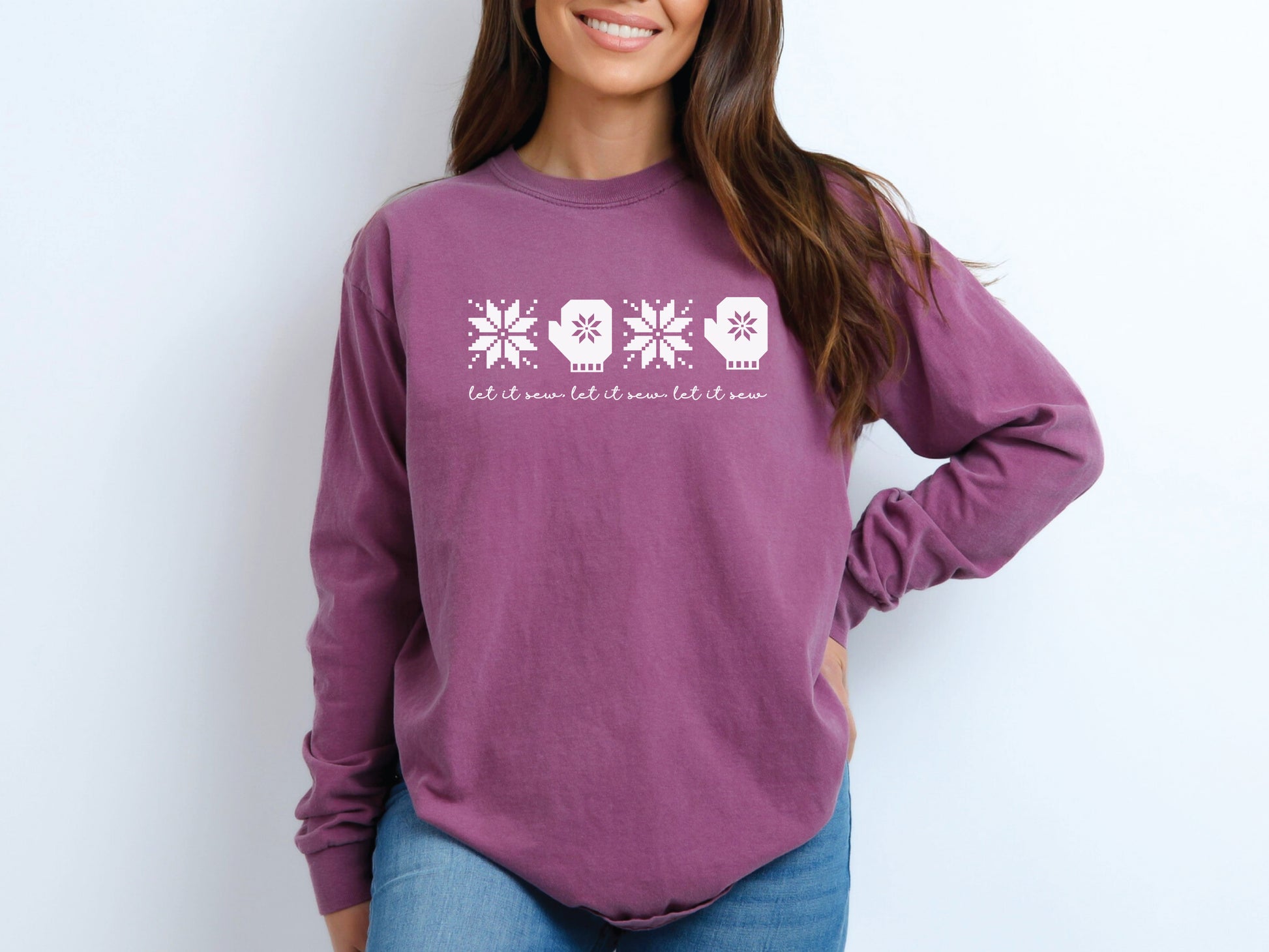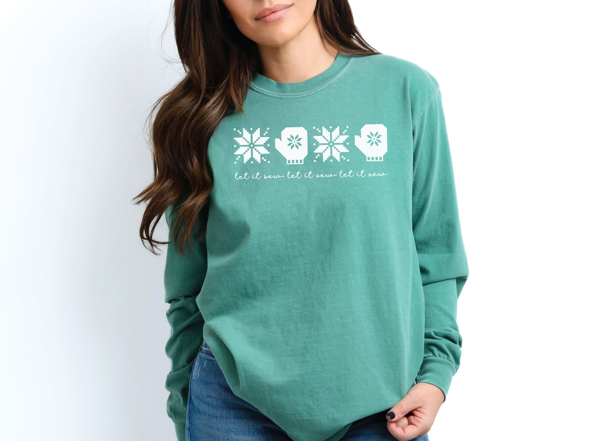 Get into the holiday/winter spirit with our "Let It Sew" Long Sleeve T-Shirt! Perfect for quilters and holidays lovers alike this sweatshirt is perfect for cozy holiday days or attending a quilt retreat or class with your quilty friends!