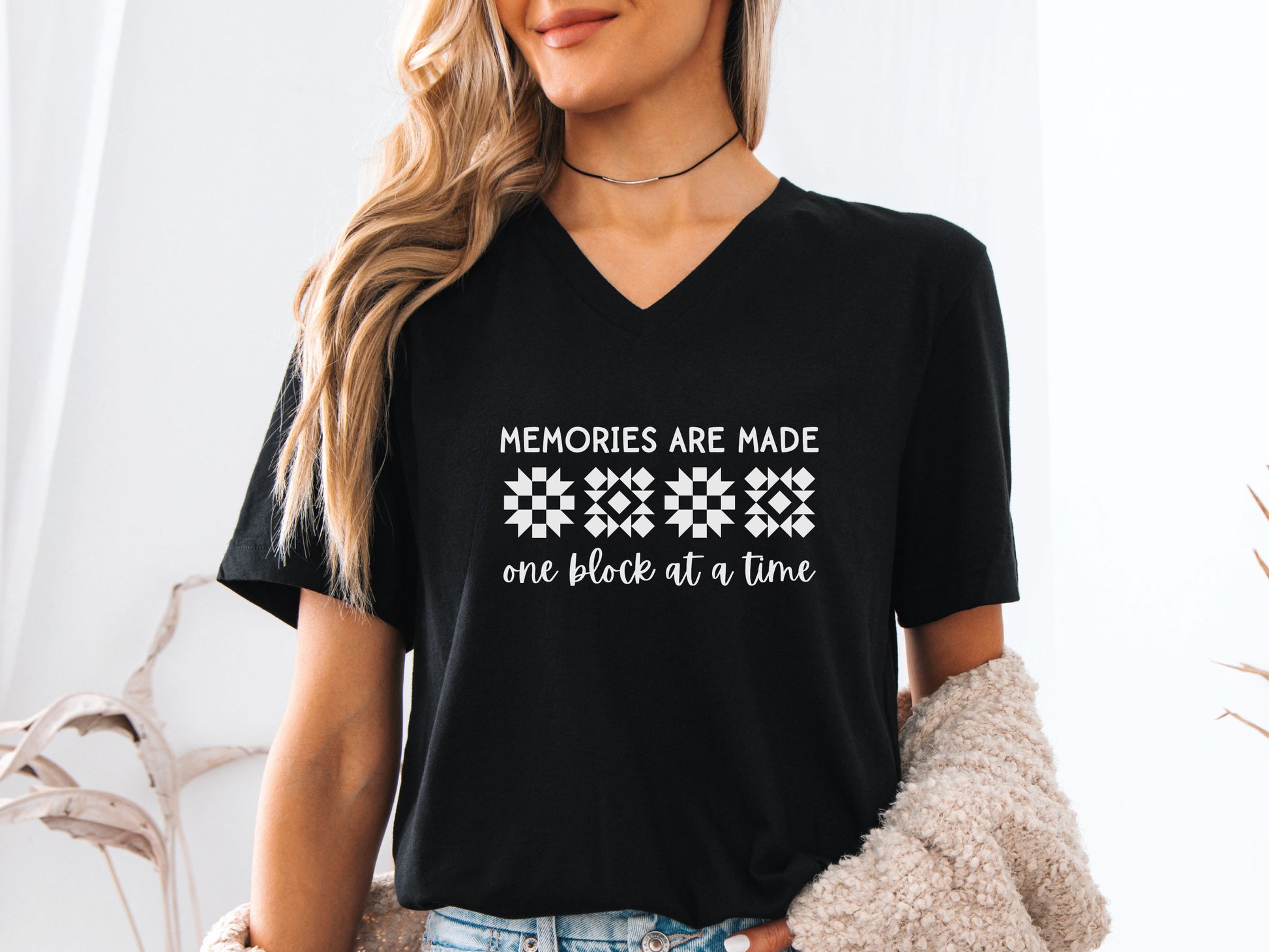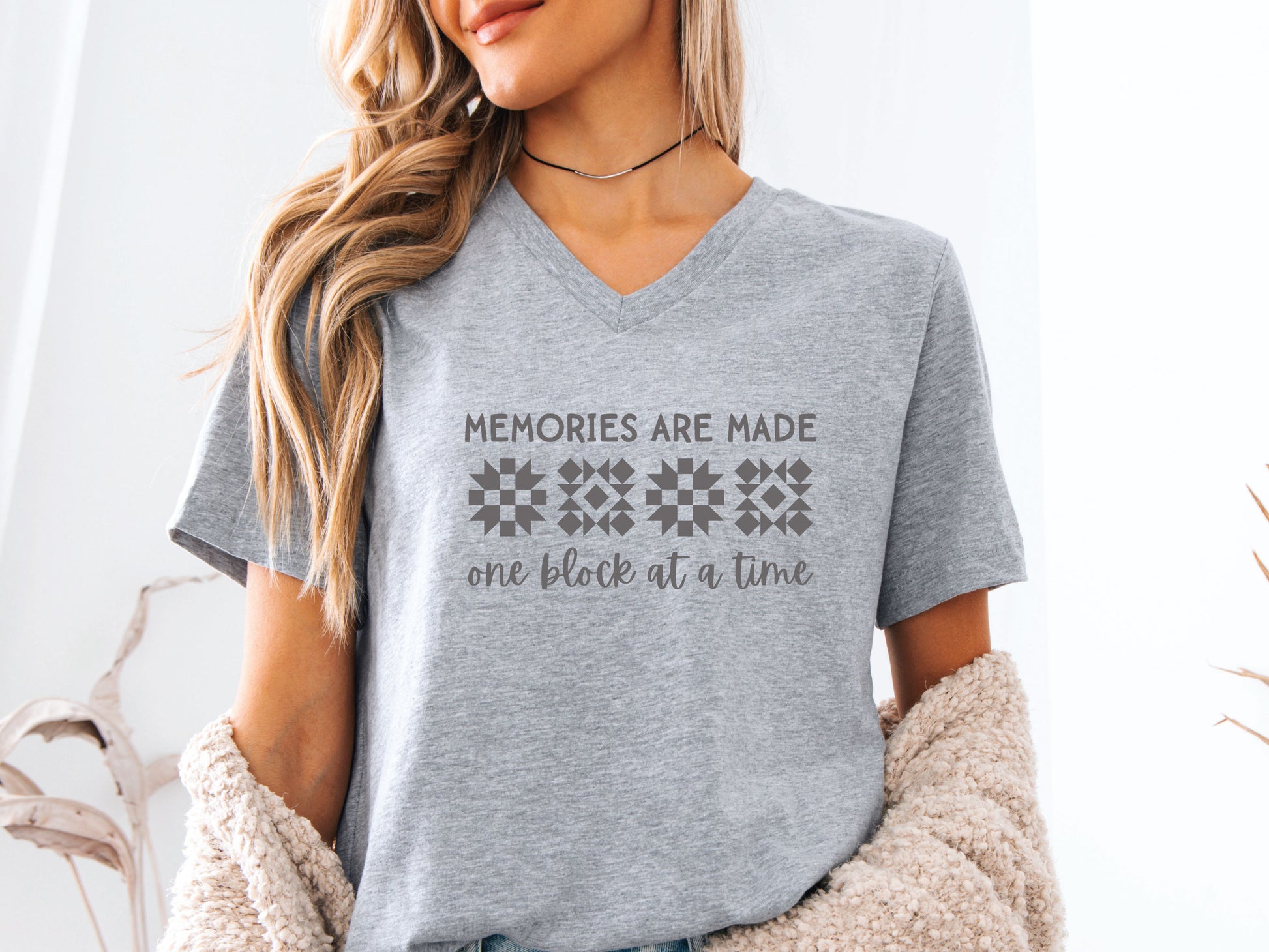 This soft and flattering V-neck is designed for quilters who know that Memories Are Made - One Block at a Time. Whether at a quilt retreat, guild meeting, or fabric store, wear it proudly and let everyone know you’re stitching up something special!