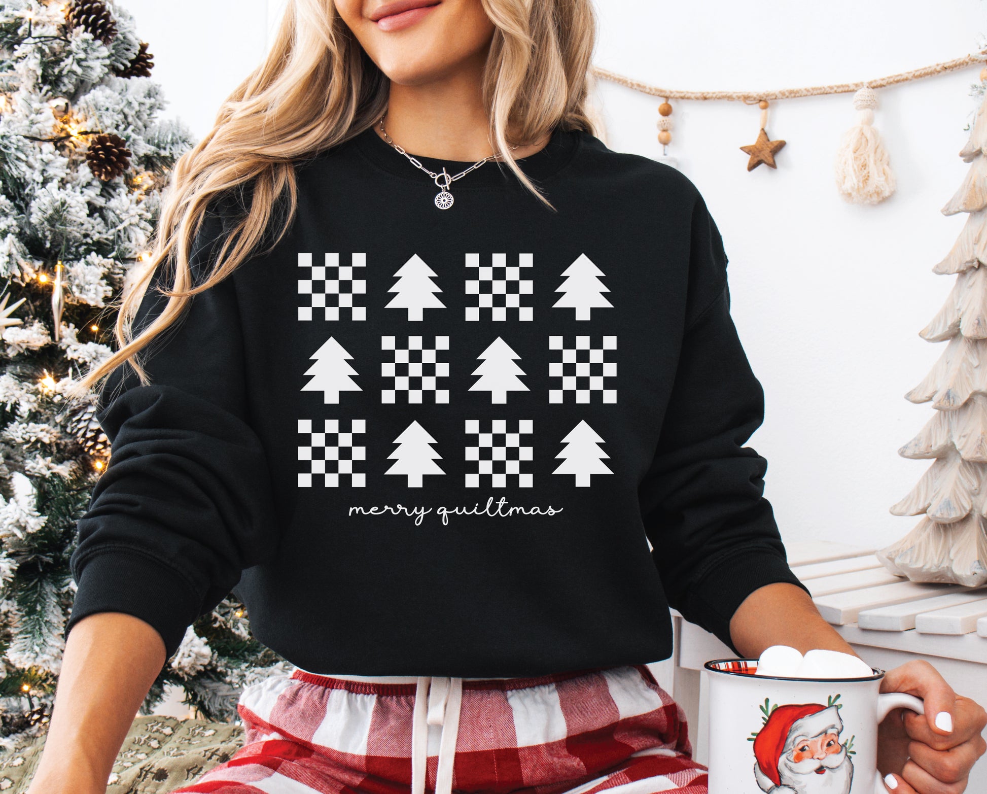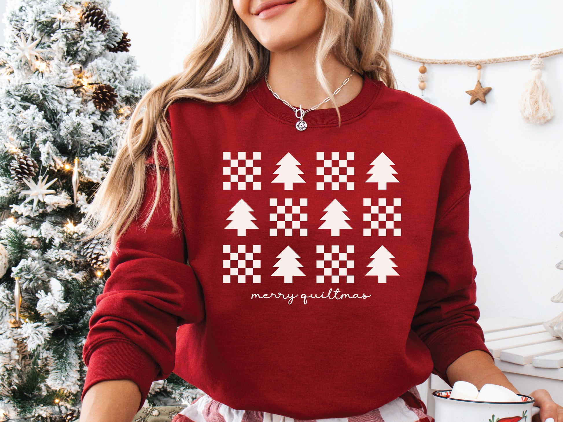 Get into the holiday spirit with our cozy Merry Quiltmas Sweatshirt! This sweatshirt features a checkerboard & flying geese quilt blocks. Perfect for quilters and holidays lovers alike. this sweatshirt is perfect for cozy holiday days or attending a quilt retreat or class with your quilty friends!