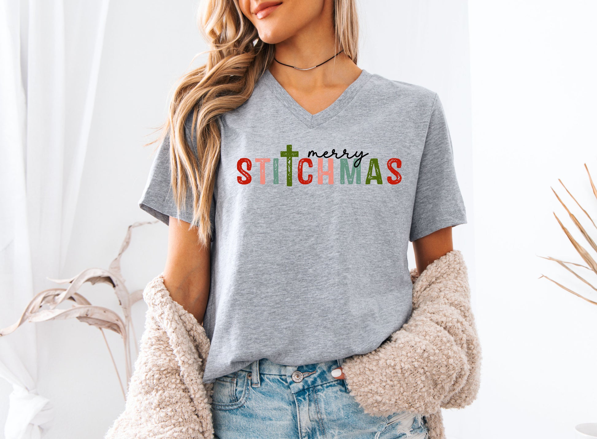 Celebrate the season of joy and creativity with our Merry Stitchmas Cross V-Neck T-shirt a festive favorite for quilters, sewists, and makers of all kinds! Featuring the word STITCHMAS with a cross-shaped “T,” this design beautifully blends your love of stitching with your faith and the spirit of Christmas. Soft, cozy, and full of holiday cheer, it’s perfect for sewing room sessions, Christmas quilt retreats, or simply spreading handmade joy at your next holiday gathering.