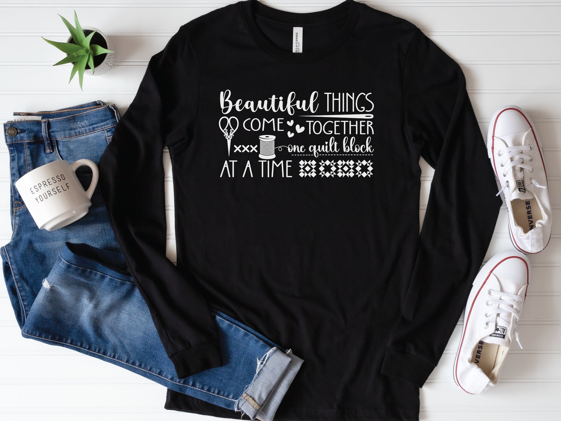 Celebrate the joy of quilting with this inspirational long-sleeved T-Shirt "Beautiful Things Come Together; One Quilt Block At A Time." This quilting themed t-shirt makes a terrific gift for yourself or for a friend who loves to sew or quilt!