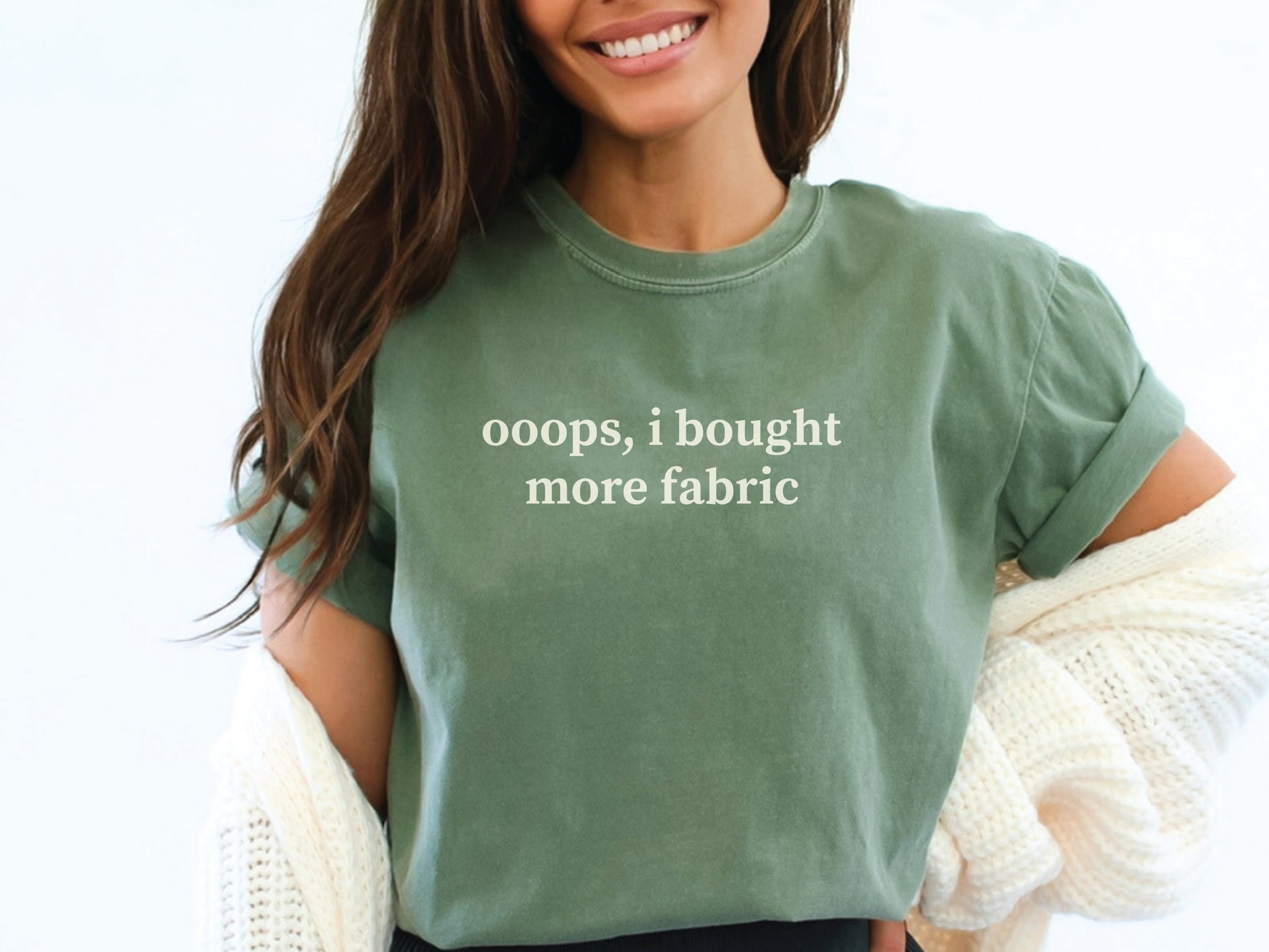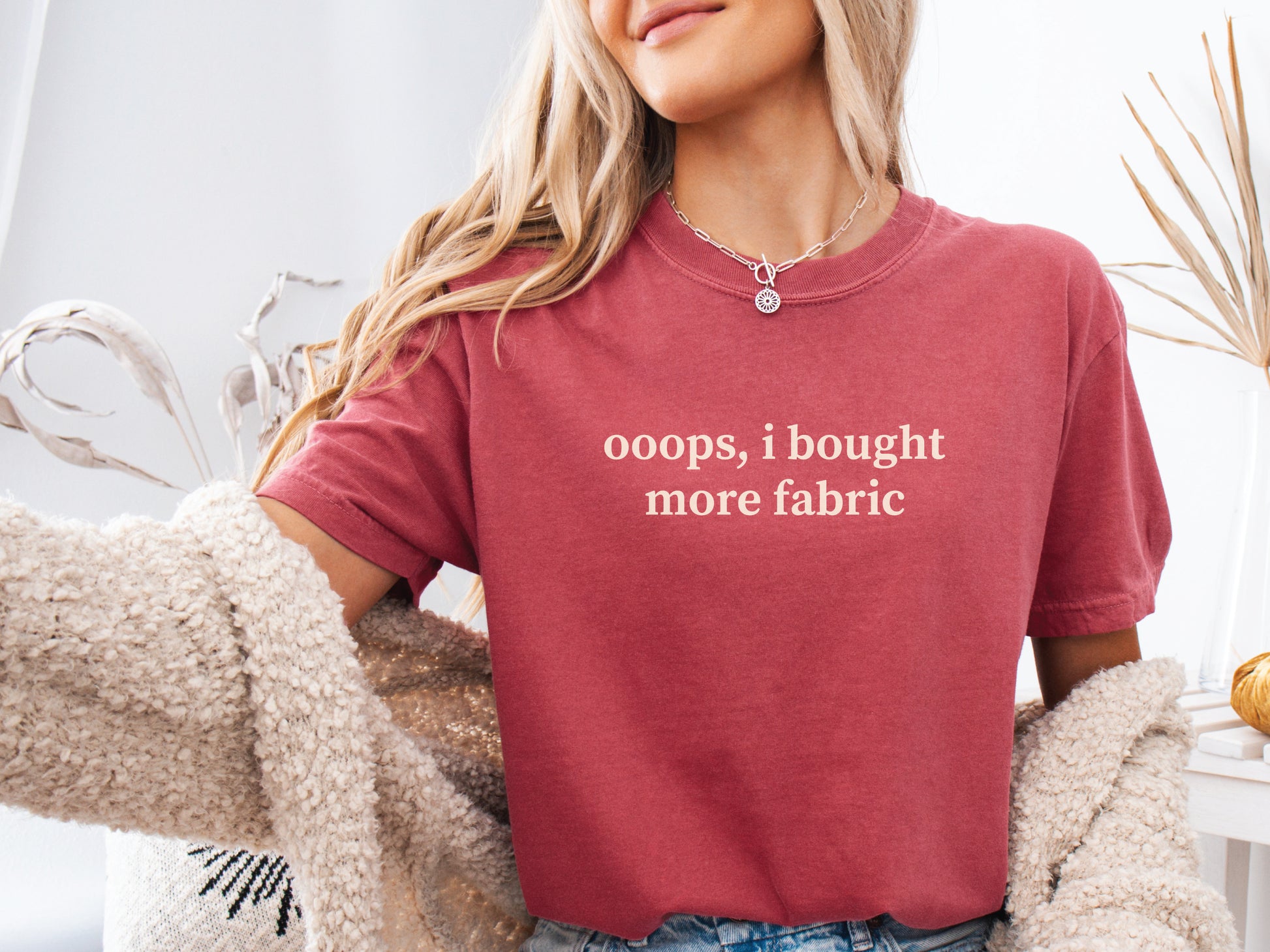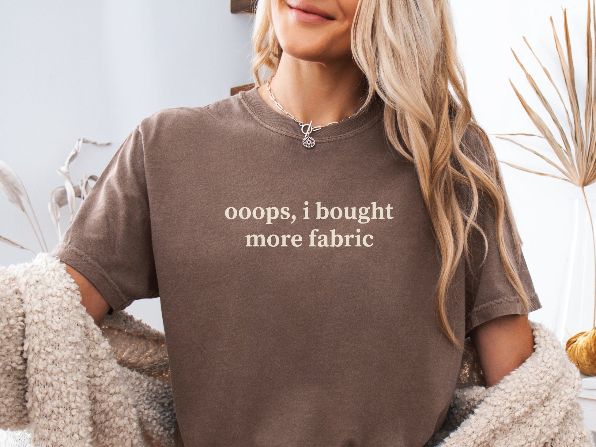 Let’s be honest—fabric has a way of following us home. This tee is for the sewist who swears they’re on a fabric freeze… until that irresistible new print shows up. Featuring “Ooops, I bought more fabric” in a clean, minimalist font, it’s your official badge of honor. Soft, comfy, and totally relatable—this shirt makes the perfect gift for yourself or your favorite stash-builder.