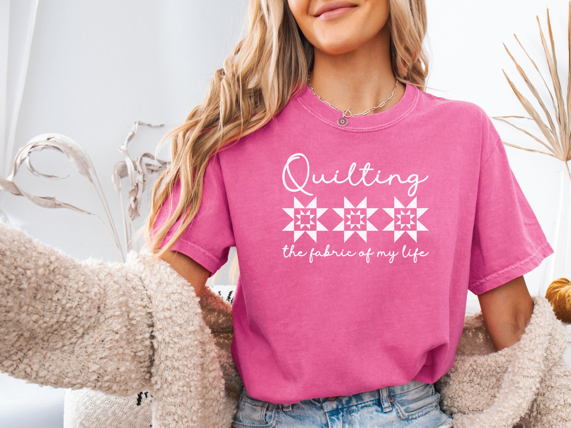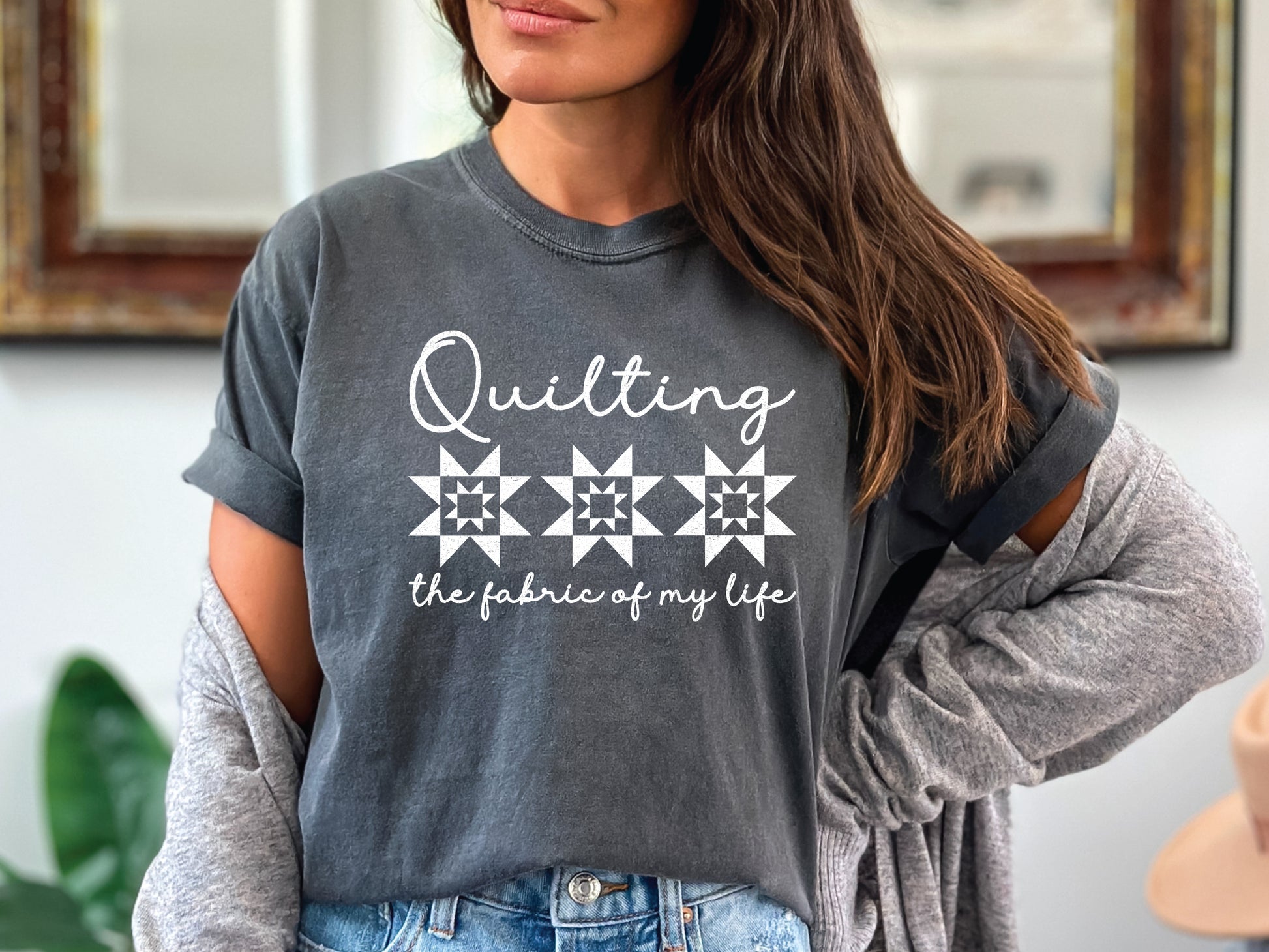 Show your love for quilting with this heartfelt t-shirt featuring the saying 'Quilting the Fabric of Your Life.' Designed with a distressed, vintage-style text, it’s perfect for those who stitch creativity, passion, and memories into every quilt.