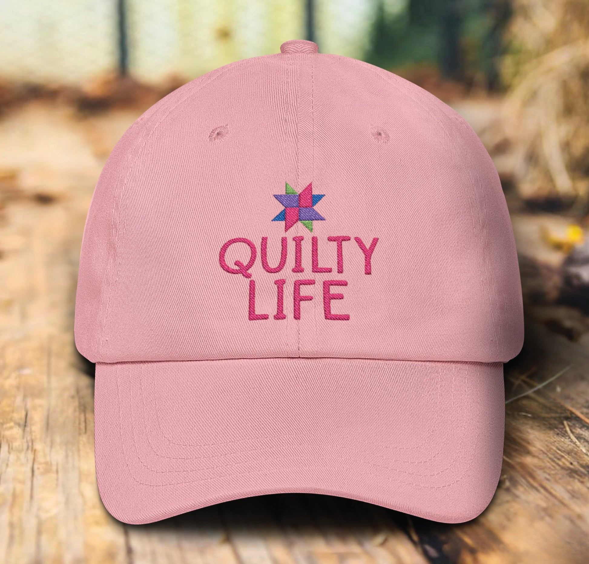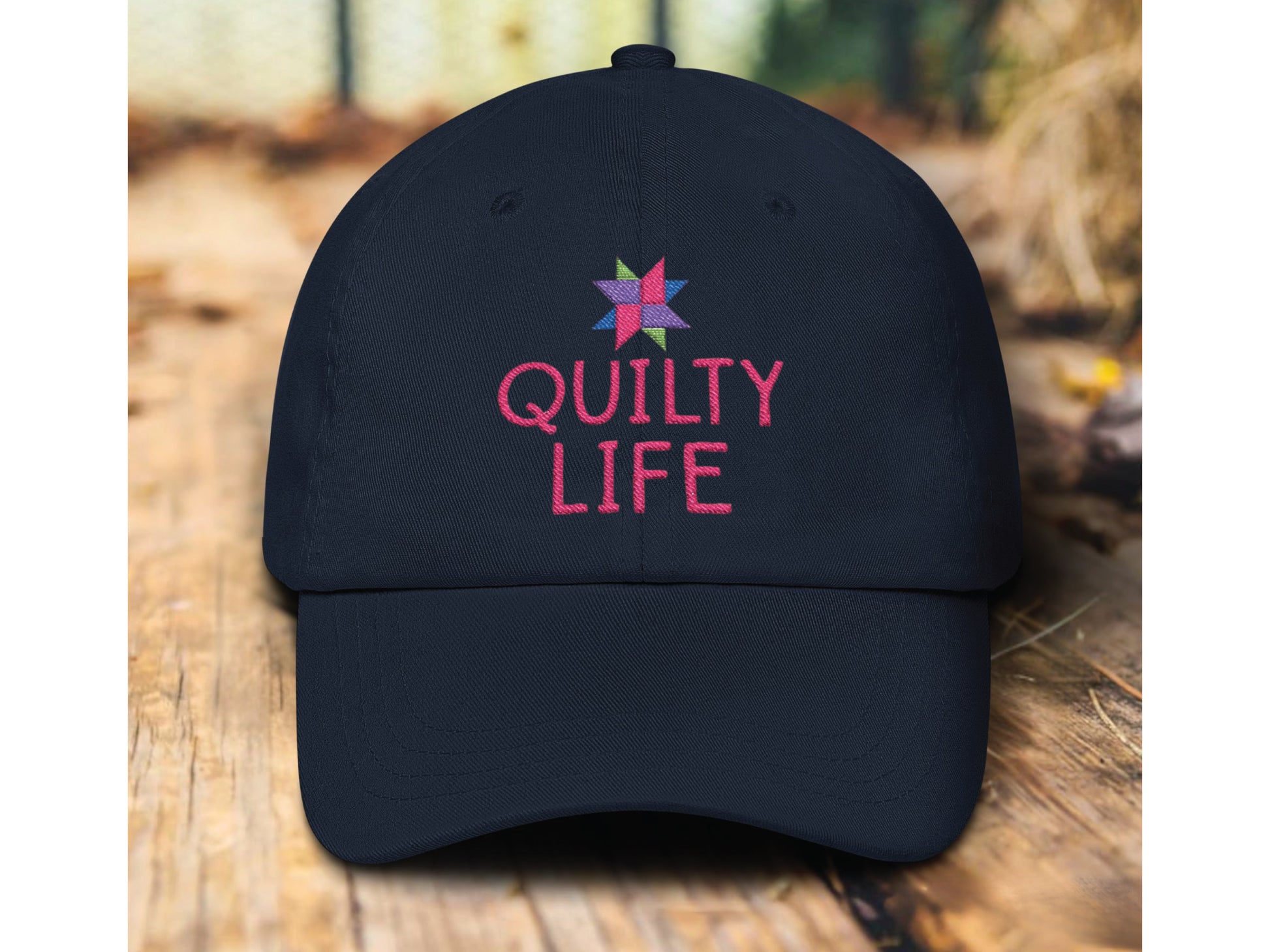 This comfortable hat features the phrase "Quilty Life" beautifully embroidered with a colorful quilt star above the text, adding a bright pop of creativity to your everyday style. Each of our hats feature a vibrant embroidery that brings a bold, cheerful vibe wherever you go. Perfect for quilt retreats, fabric shopping sprees, or simply living your best crafty life—this hat is all about celebrating your passion for quilting with flair and fun.