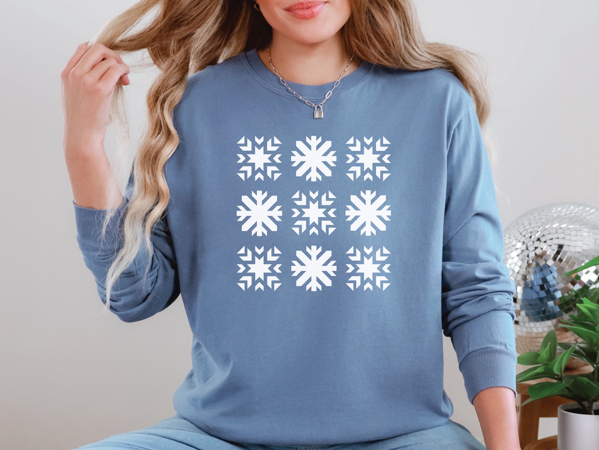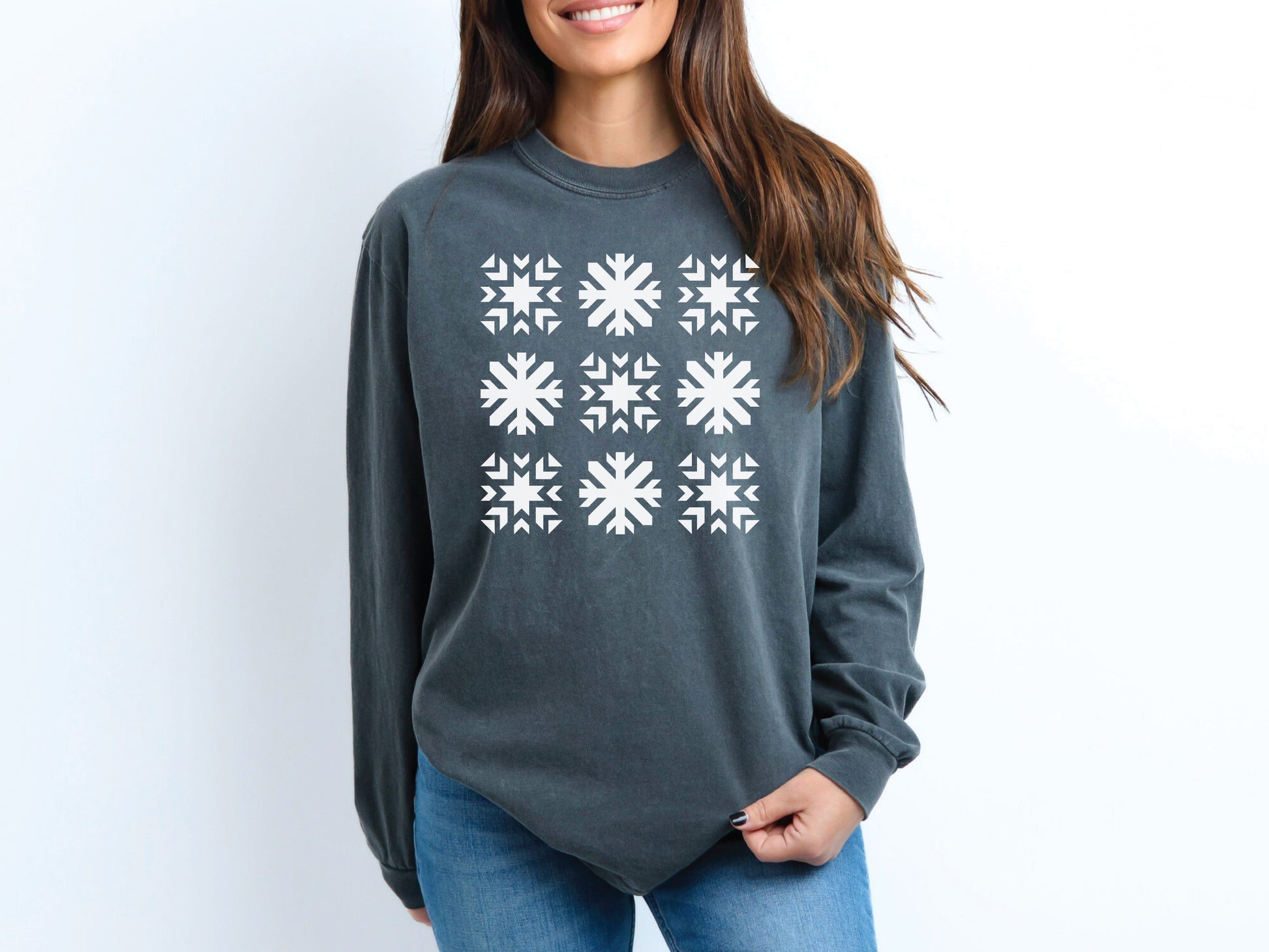 Get into the holiday/winter spirit with our Snowflake Quilt Block Long Sleeve T-Shirt! Perfect for quilters and holidays lovers alike this sweatshirt is perfect for cozy holiday days or attending a quilt retreat or class with your quilty friends!