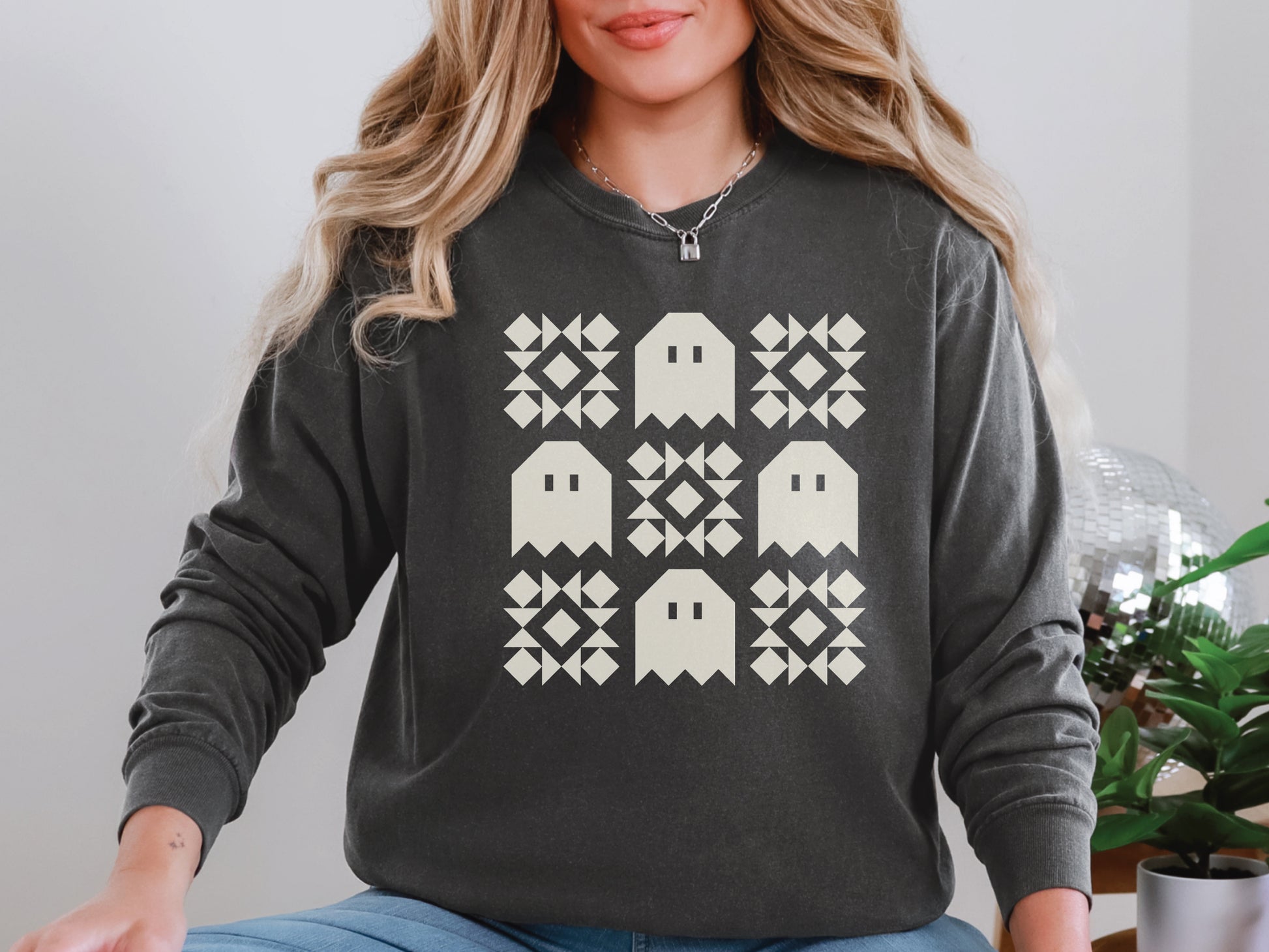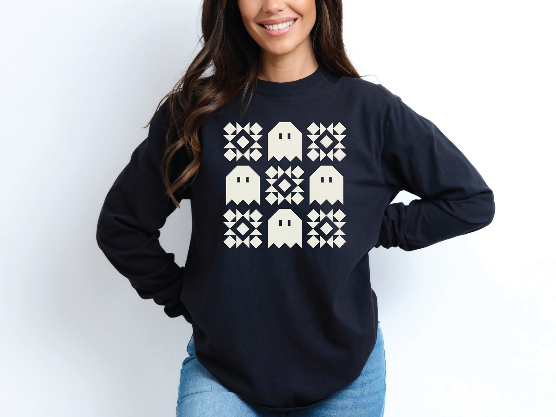 Inspired by all the cute Halloween quilt patterns & quilt blocks, we created this long sleeve t-shirt design with quilty spooky ghosts! The long sleeve t-shirt is available in all the rich beautiful fall colors with a cute quilt block and a ghost in a grid style. Perfect for the quilter who loves a dash of Halloween flair. Wear at your next quilt retreat, class or at you next quilting get together!