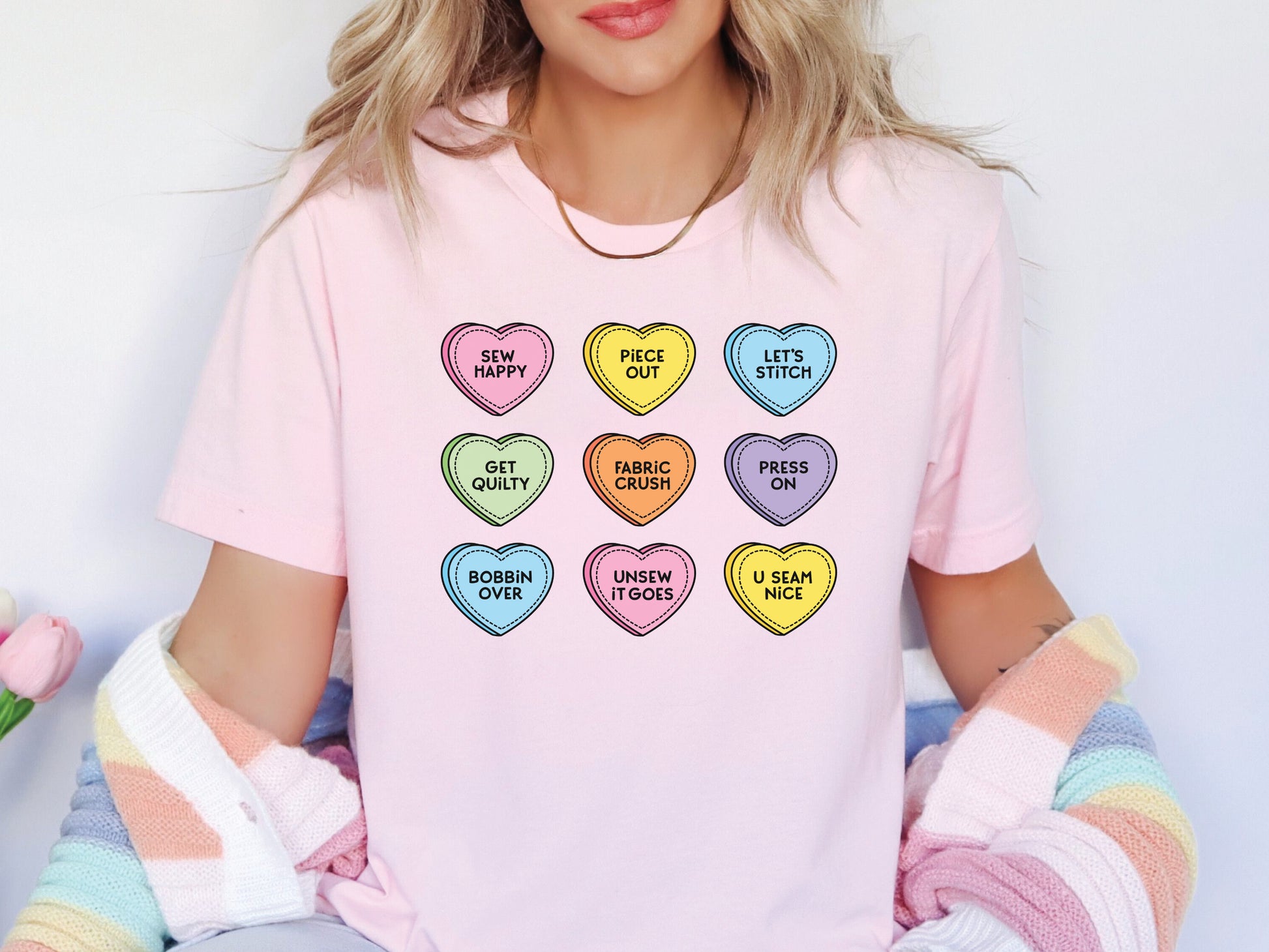 Celebrate Valentine’s Day with this charming t-shirt for quilters and sewers! The design features nine pastel conversational hearts, each showcasing clever phrases like “Sew Happy,” “Get Quilty,” and “Fabric Crush.” A playful nod to the craft you love, this tee is perfect for stitching up love all season long!