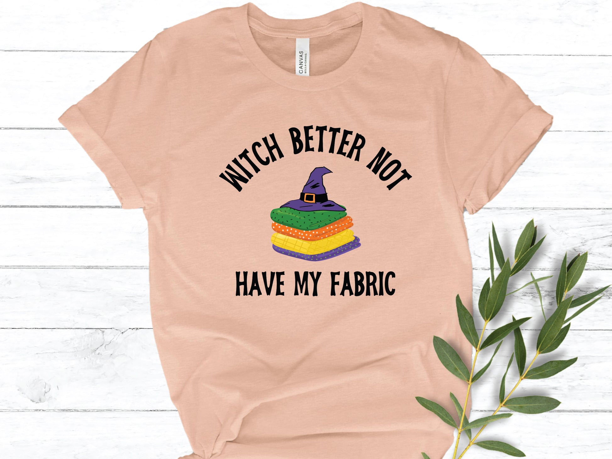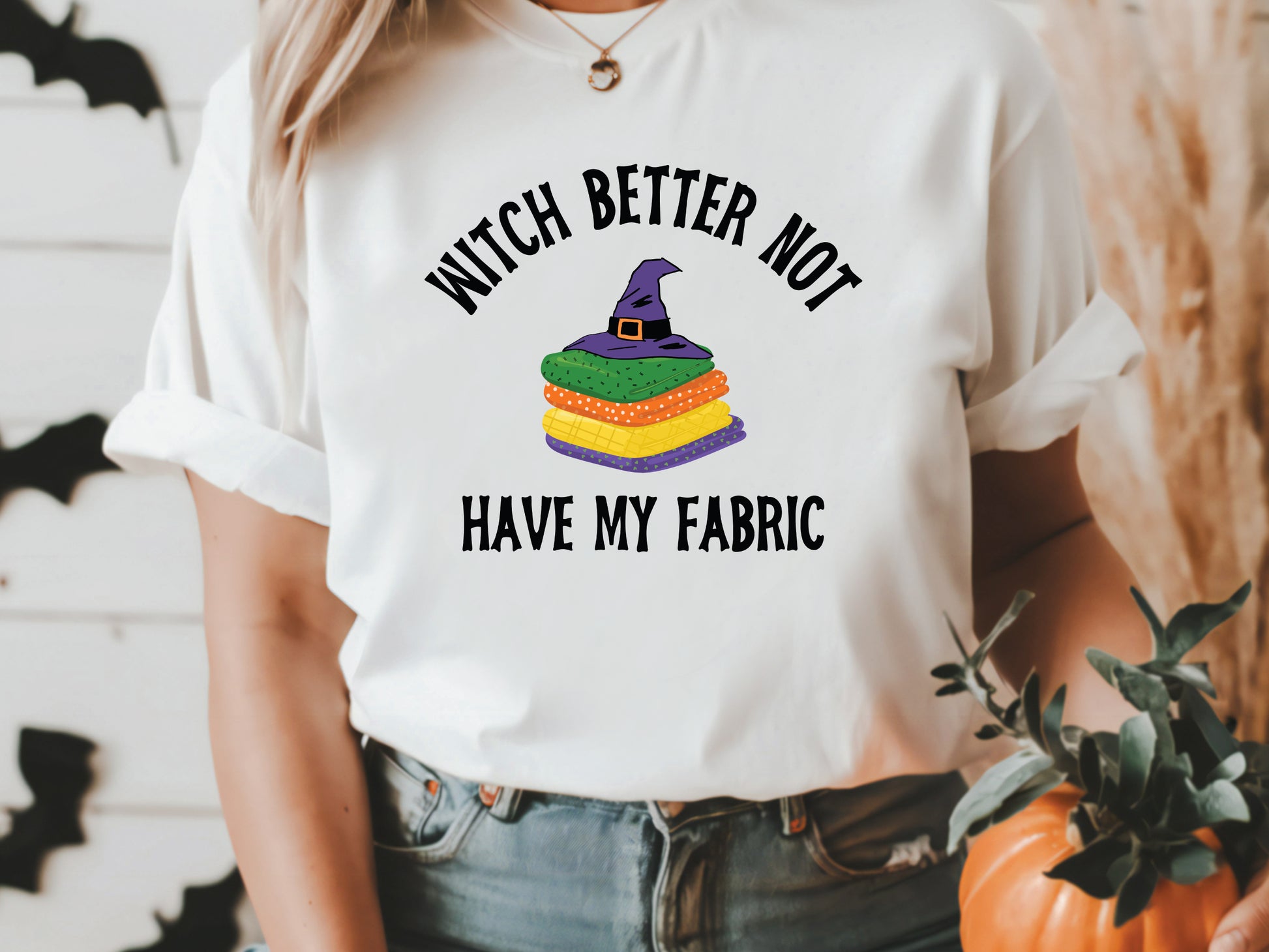 This fun and quirky Halloween t-shirt design is perfect for the fabric lover who lets everyone know their fabric stash is off-limits! The shirt has a sassy witch twist that's for perfect wearing during Halloween events for the dedicated sewist and fabric collector!